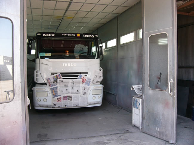 Il reparto di carrozzeria dispone di un'area di 1000 mq coperti dove sono installate le attrezzature necessarie per il ripristino a nuovo di qualsiasi veicolo industriale, è compreso anche un forno di verniciatura.